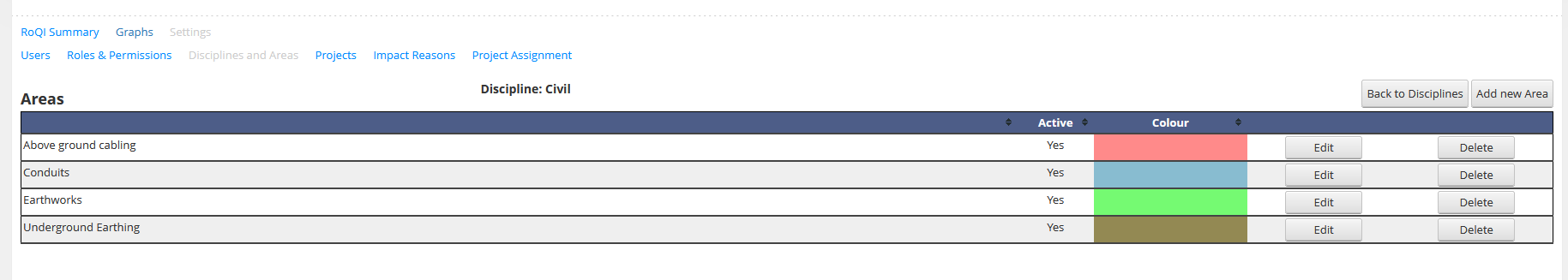 The Disciplines can be regarded as a list of categories used to group similar RoQI items, and the Areas can be regarded as sub-categories.